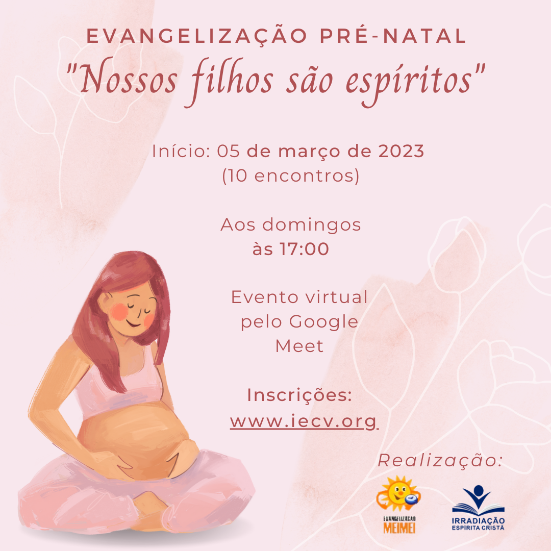 O setor de Evangelização Pré-Natal da Irradiação Espírita Cristã, convida os casais grávidos, aqueles que estejam desejando engravidar, todas as pessoas que trabalhem no processo da fertilidade e gestação ou aquelas que se interessarem pelo conteúdo do programa para se inscreverem na próxima turma do curso “Nossos filhos são Espíritos”, que terá início no próximo dia 05/03/2023, aos domingos às 17:00 horas. O referido curso aborda a gravidez no seu âmbito físico e espiritual, promovendo a compreensão do processo gravídico e reencarnatório, no sentido de promover a harmonização e a integração afetiva entre os pais e o Espírito reencarnante.